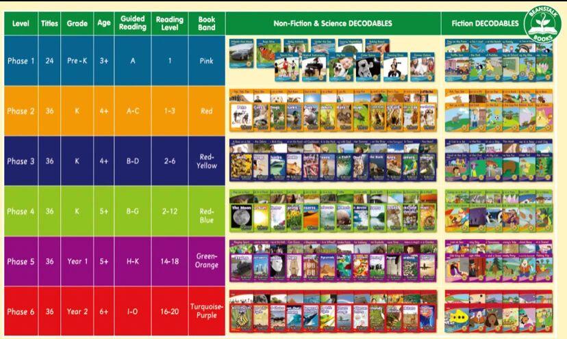 这套科普分级共132册,根据英国教育部大纲标准划分为6个阶段,从Phase 1 到 Phase 6,孩子一边读科普,一边巩固自拼规则。