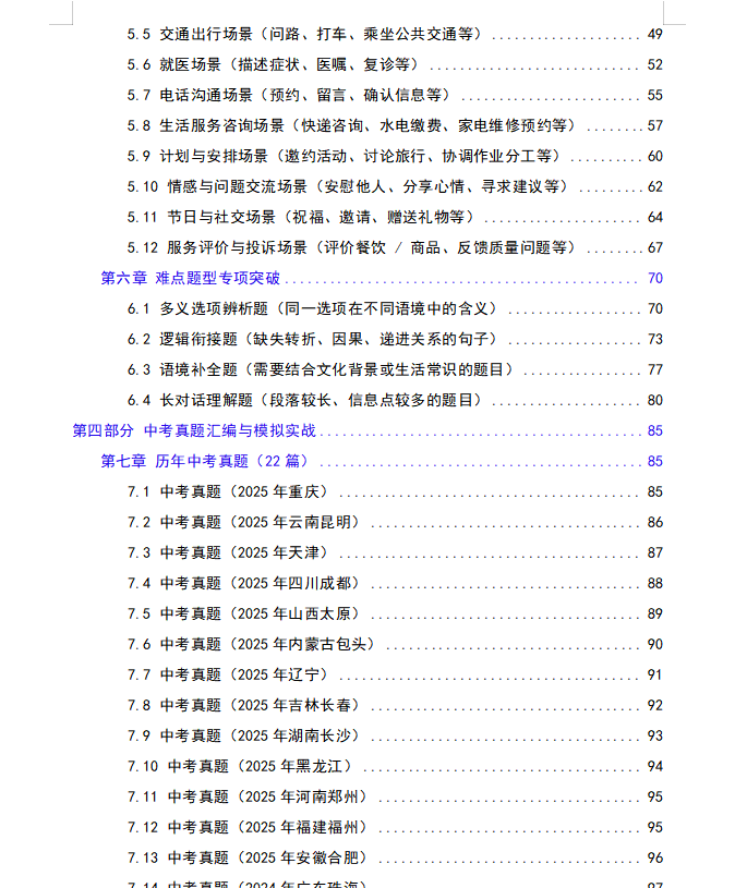 – 训练分层:从“历年中考真题(13篇)”到“模拟真题训练(18篇)”再到“名校模拟训练(20篇)”,难度梯度清晰。如模拟题融入“人工智能、丝绸之路、24节气”等热点话题,既训练语法运用,又拓展文化视野。