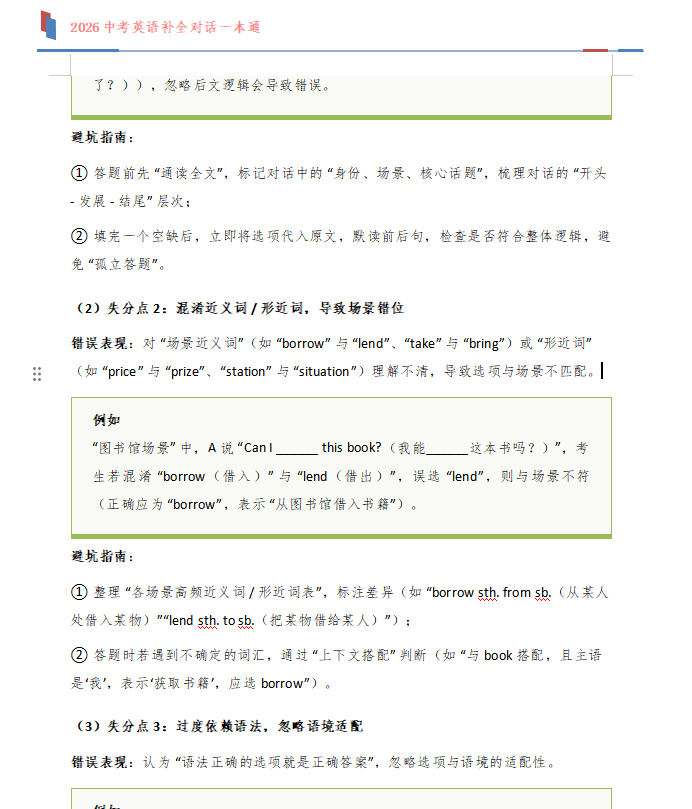 – 逻辑深解构:基于“疑问-回答”“因果-转折-并列”等逻辑关系设计解题技巧,同时针对“多义选项辨析、逻辑衔接题、语境补全题”等难点题型专项突破。如“多义选项”中,“Sure”在“请求场景”表示同意,在“疑问场景”表示确认,需结合语境判断。