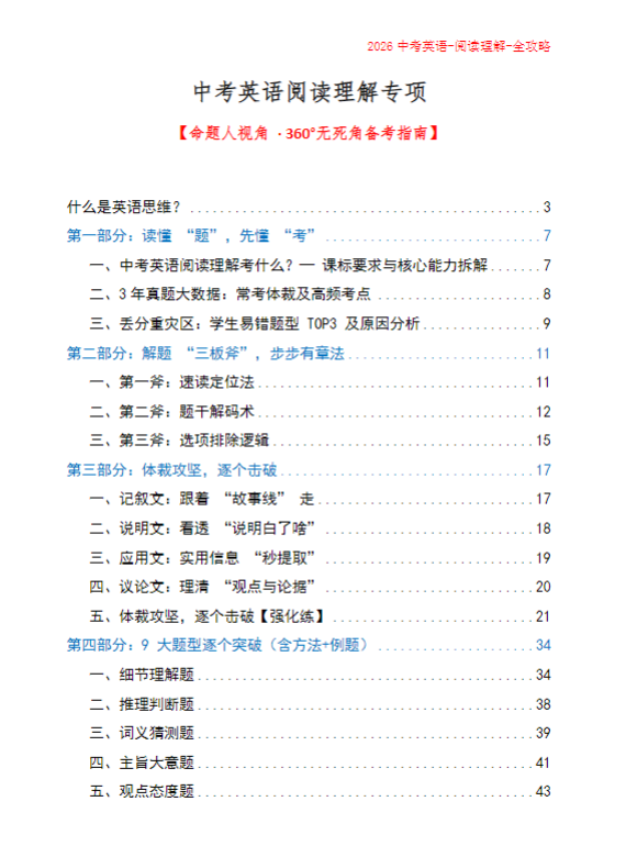 – 考点全拆解:以《中考英语阅读理解专项》为例,不仅梳理“3年真题大数据”明确常考体裁(记叙文、说明文、应用文、议论文)和高频考点(细节理解占50%、推理判断占30%等),还对“丢分重灾区”(如推理题过度推断、词义题语境脱离)进行错误归因,让考点从“模糊感知”变为“精准认知”。